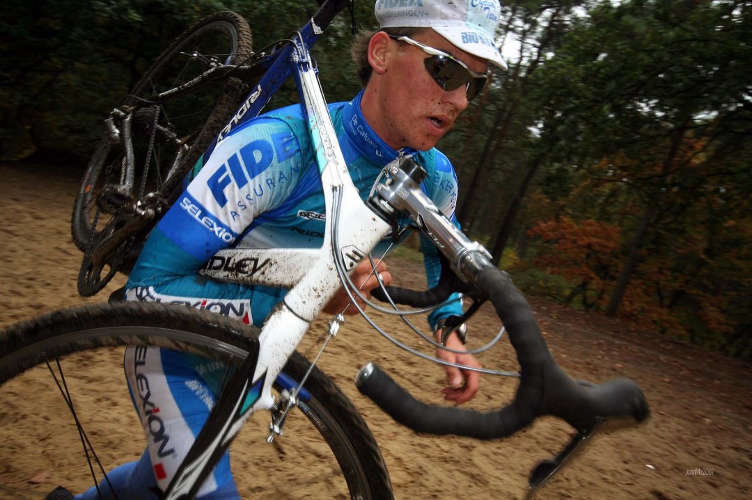 A string of professional cyclo-cross stars raced toward me, as I, with camera in hand, got ready to shoot – ‘Click’ went the shutter, ‘flash’ went the bulb and at that same moment Bart Wellens’ crashed to the ground screaming, “I can’t see, I’m blind, I can’t see”.