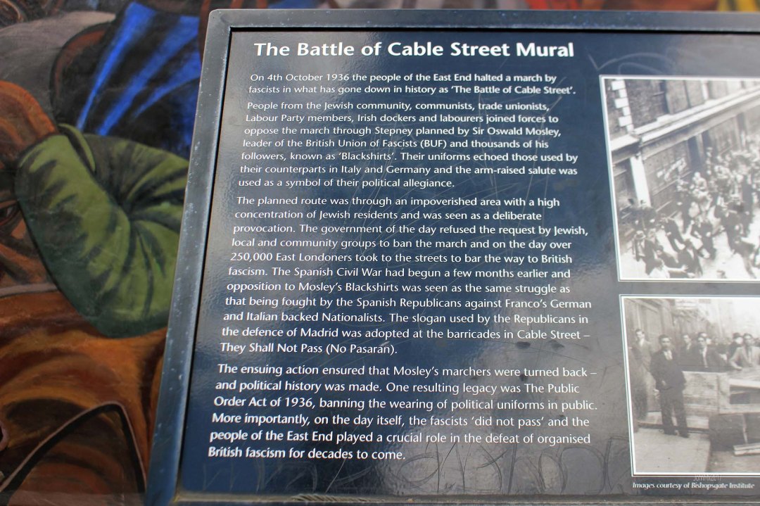 Pictures include the western entrance to Cable Street looking east, which now has a Cycling Superhighway running its length, a plaque marks the event above an estate agent at Dock St and the ‘Battle of Cable Street’ mural painted on the wall of St George’s Town Hall. The mural is not situated at the front line rather the barricade was further west at Christian Street toward Mint Street (with the Tower of London beyond) and it was at this point where anti-fascists and Police confronted each other as the latter attempted to clear the road to allow the ‘Black Shirts’ to march.