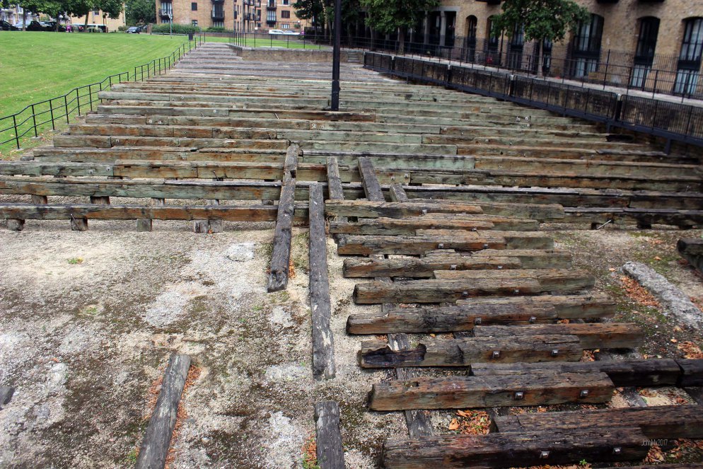 The pictures show one of the two wooden cradles still in situ at Burrell’s wharf, abandoned launch rams at Old Millwall Dock and Old Millwall Dock (which was too small for the ship) looking out into the Thames.