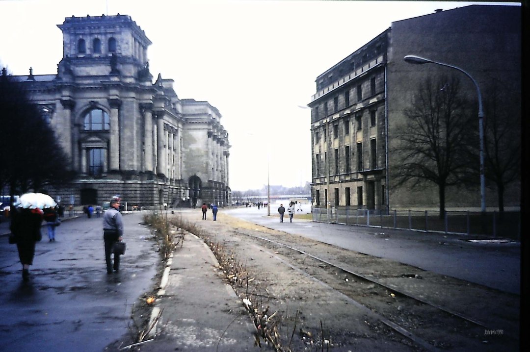 The wall once pushed right up to the Reichstag but has been demolished here 1991