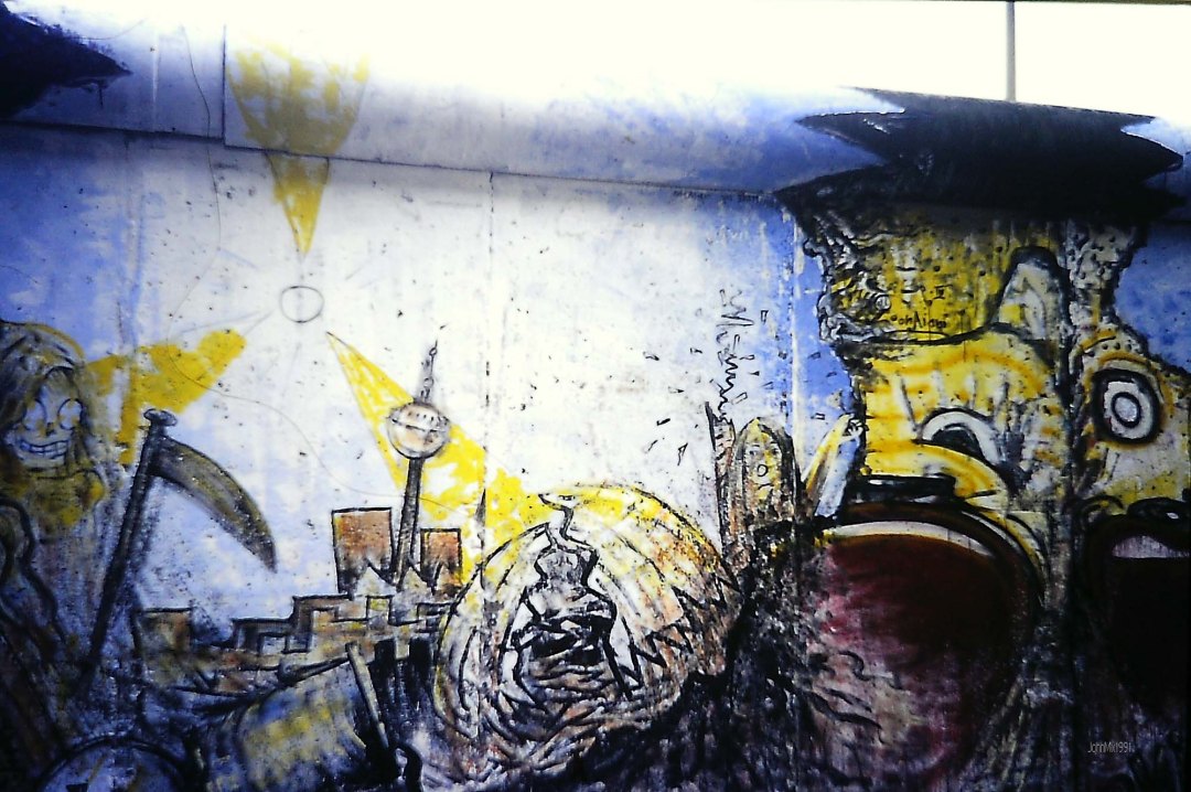 Plumbing at the wall, painted church under the bridge on the wall, wall being dismantled and an East German youth festival