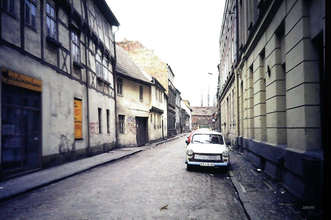 Earlier in the day I had looked at East German suits priced at 30 east marks (approx… £5) which seemed to be made out of wood chips, at the Centrum department store in Alexander Platz, situated close to Karl Marx Platz. We also viewed the DDR goose-stepping guard of honour at the monument to anti-fascism. Much of what the DDR produced was sold to the west to get dollars or west marks and so the cream on offer in shops was always ‘Ersatz’ (including cakes). One import I did see was in the Prenzlauer district where a row of Colnago cycles were lined up within a bike shop bedecked in Soviet and East German team jerseys and skin suits – being an idiot cycle mad tourist I tried to talk with the staff but they just sniffed at me. After the wall fell I returned to the shop to find it the same with the same attitude of distain, but now featuring a row of Treks and not a Colnago in sight.