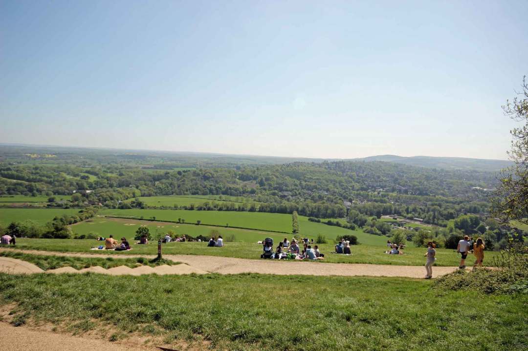 The viewing spot at the top of Box Hill – to the right is Leith Hill and below is Dorking