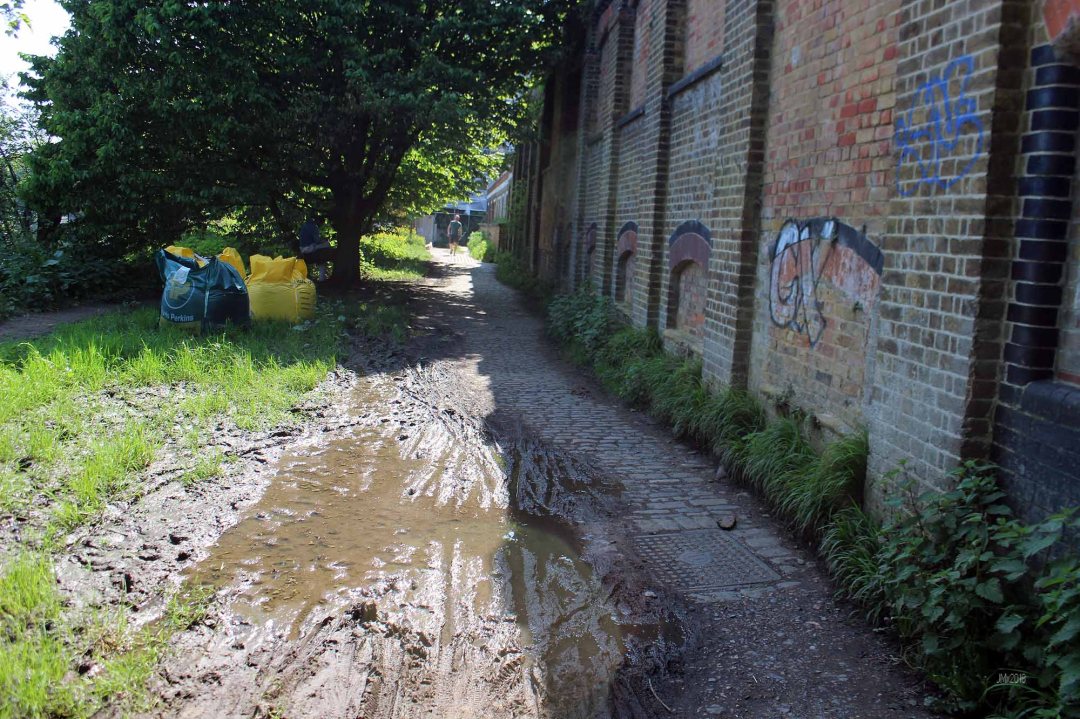 A cobbled section alongside ‘The Stag Mortlake Brewery’ if coming from Hampton Court.
