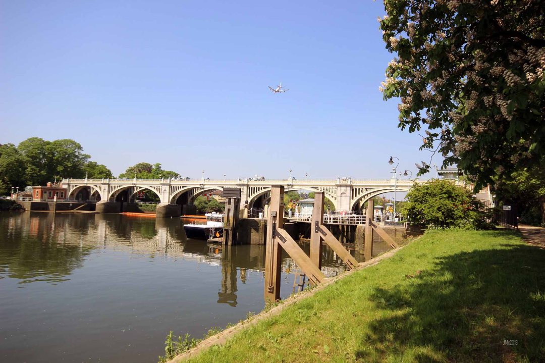 Richmond Lock Footbridge when coming from Hampton Court  Note the aeroplane set to land at Heathrow on what is a major air corridor above.