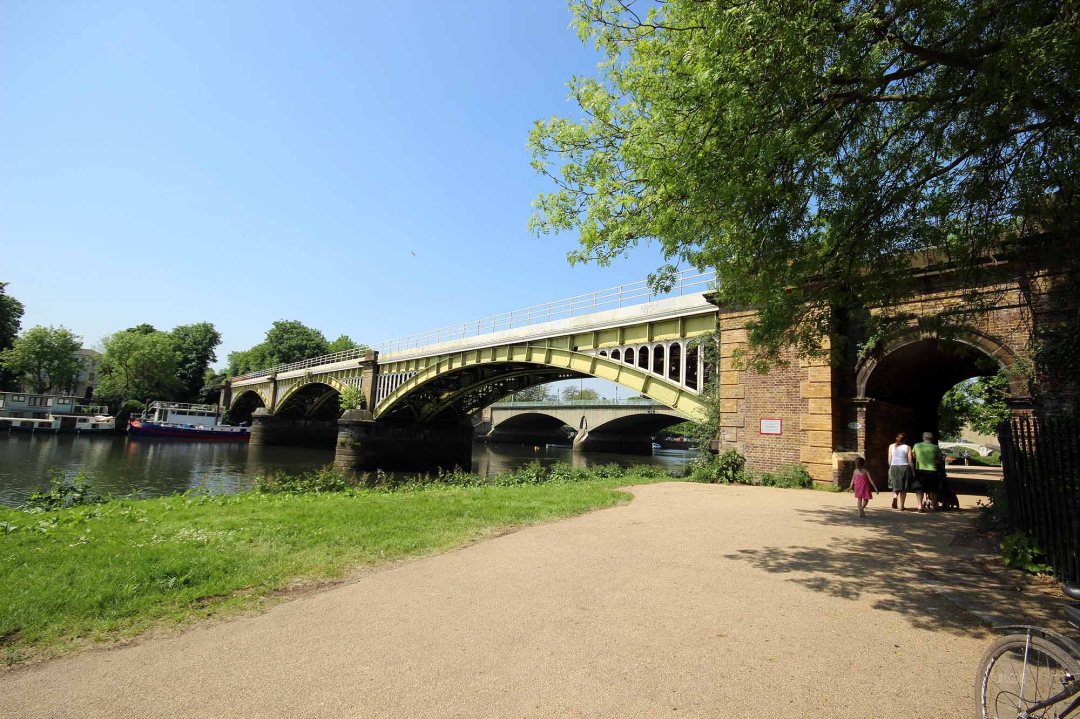 Kew Bridge when coming from Hampton Court, nearby are the famous Kew Botanical Gardens.