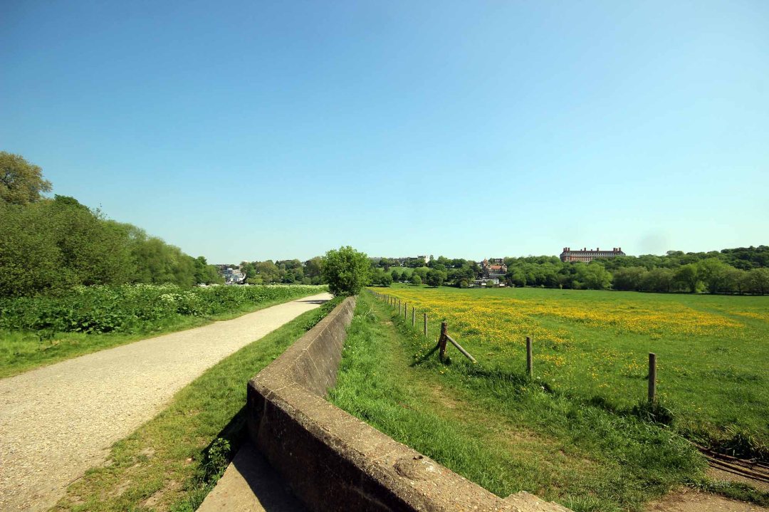 To the left is Syon House across the river – to the right (from Hampton Court) are Kew Gardens.