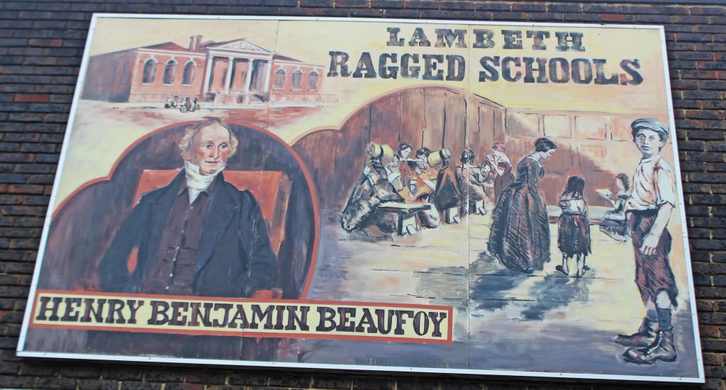 Once a lively place, so lively they wrote a song about Lambeth Walk but now thanks to poor architecture and planning the area lacks life. Five wooden boards depict ‘Doing the Lambeth Walk’ song, the Old Vic Theatre, theatrical producer and manager Lillian Bayliss, the Ragged School and the Doulton Pottery Works all being local to the area (further up the street the post World War Two film Passport to Pimlico was made on a V1 and Blitz bomb site).