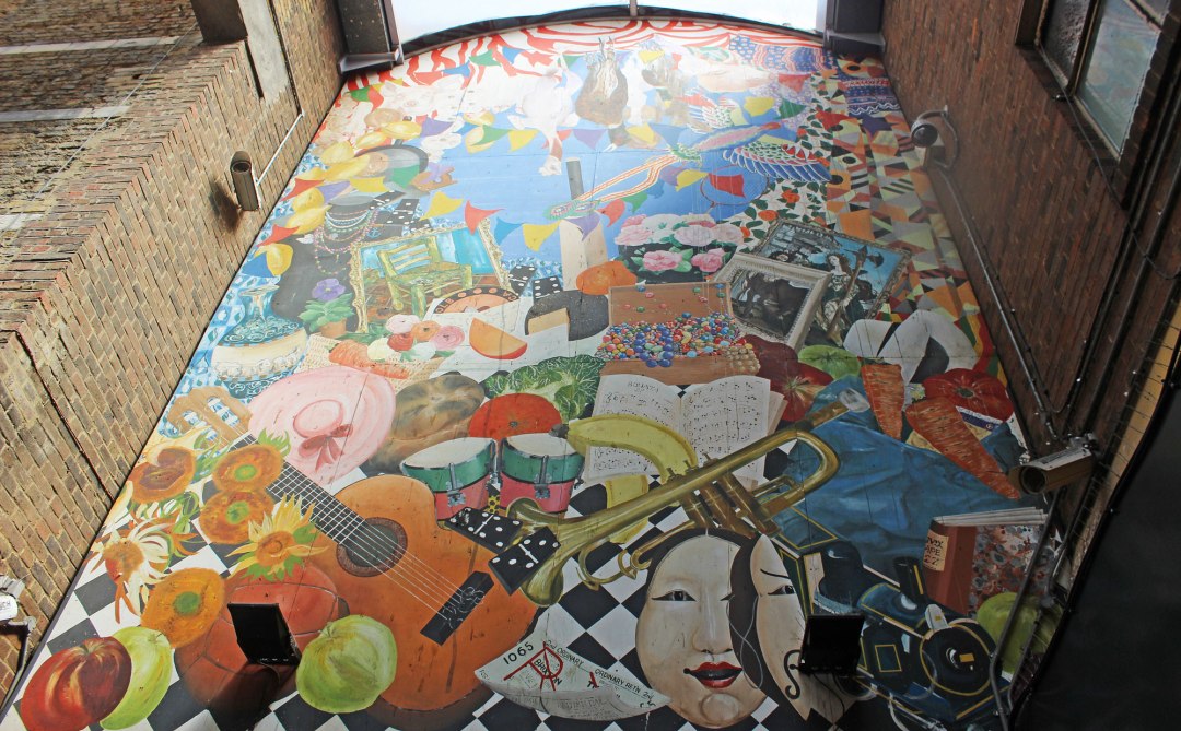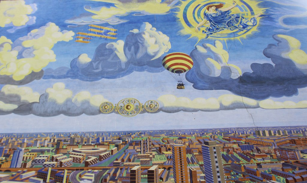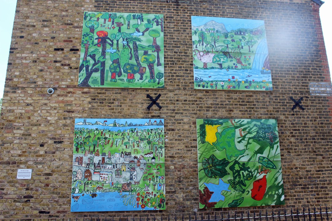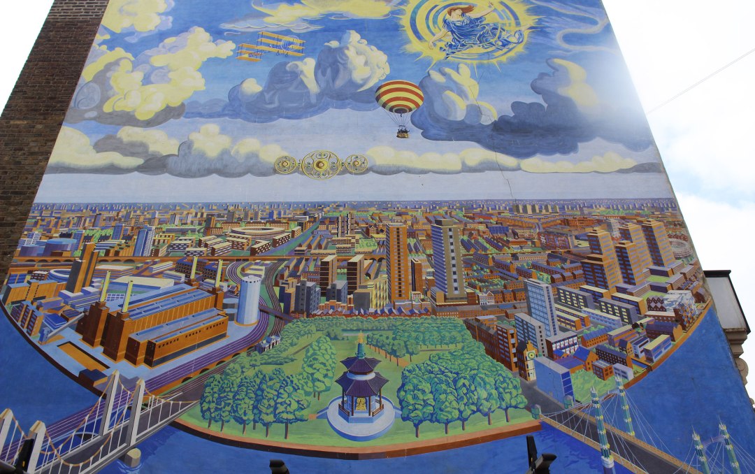A mural with a strong narrative depicting the Battersea area from the air – featured is Battersea Park with its Peace Pagoda, Battersea Power Station and the River Thames.