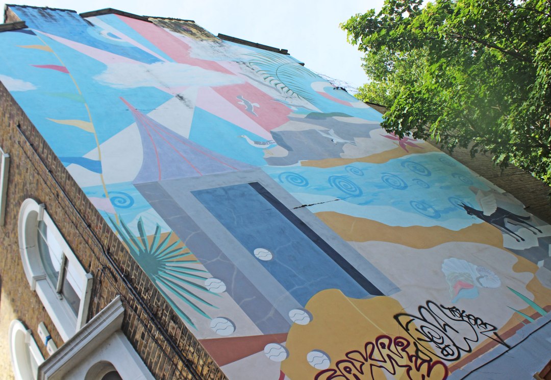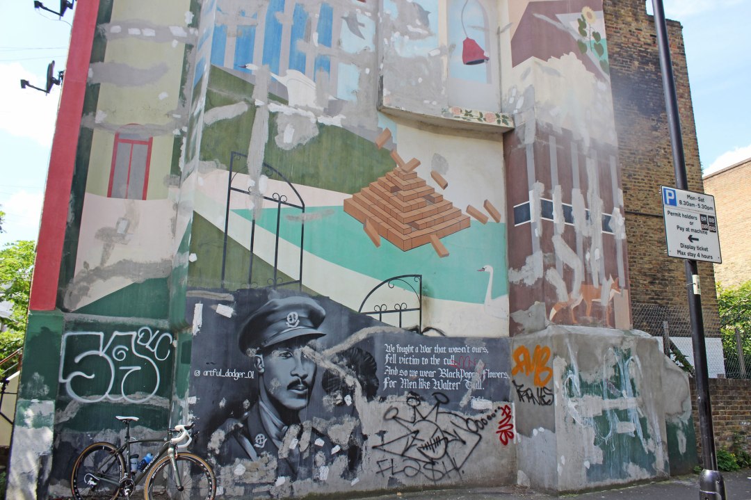 This is an amazing mural featuring a 1948 Olympic participant, the now underground River Effra powering a water mill and a place to have a splish-splash. Also featured is Doulton Pottery and it is a reminder of Brixton’s pre-industrial and pre-urban life.
