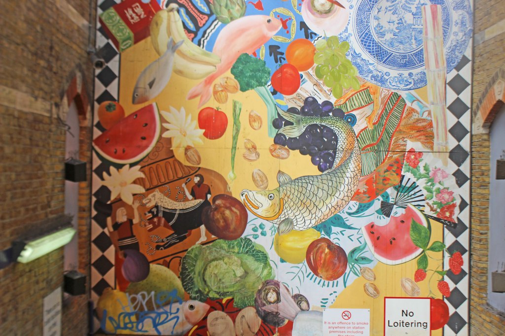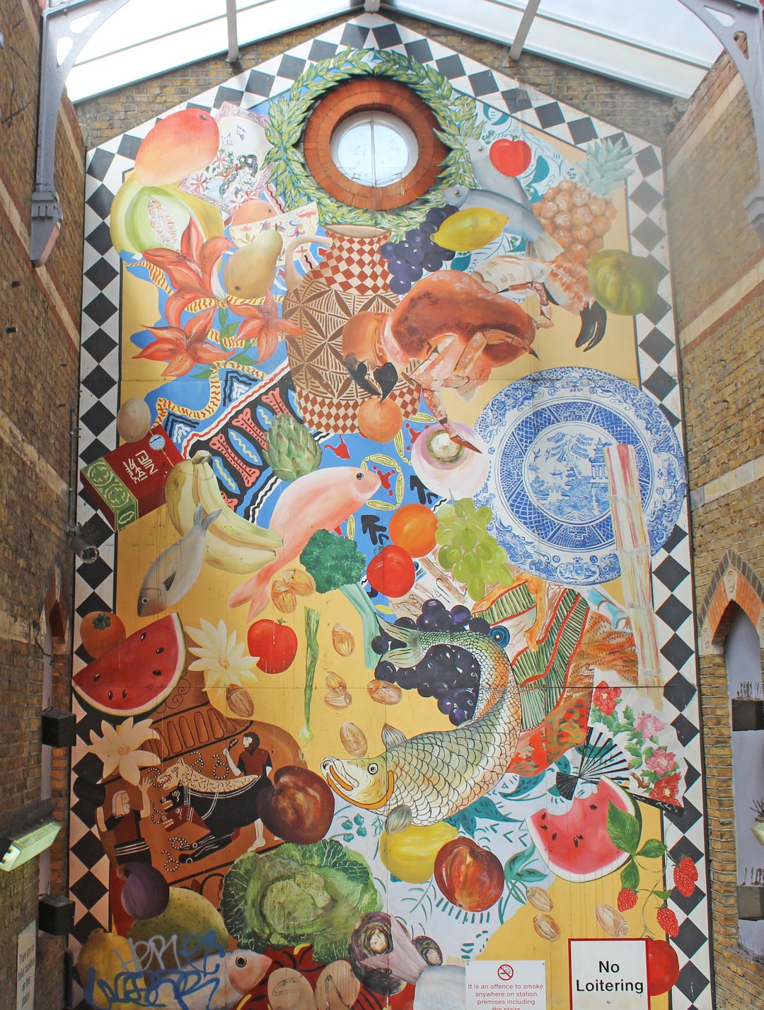On the stairs leading to the south bound platform is this mural, Brixton Food depicting the vegetables, fruit, meat and fish, a wee bit of crockery all on offer in the adjacent Brixton Market at that time.