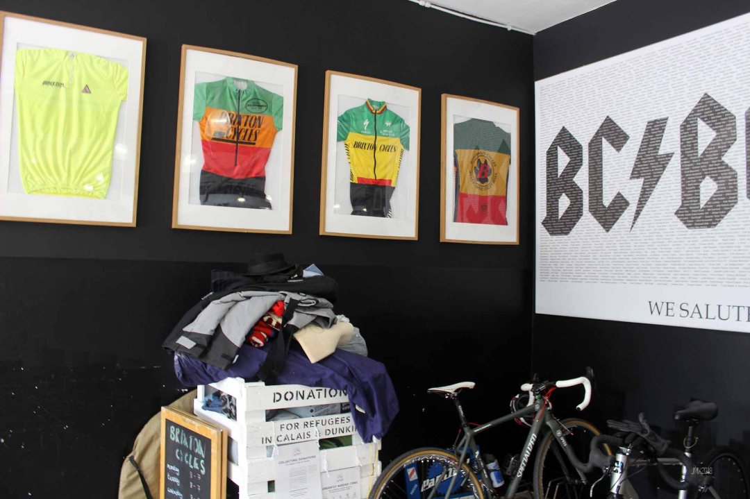 Brixton shirts over time, the list of the many who crowd funded a recent move, my bike safely stored whilst I was in the shop and a drop off point for donations for refugees