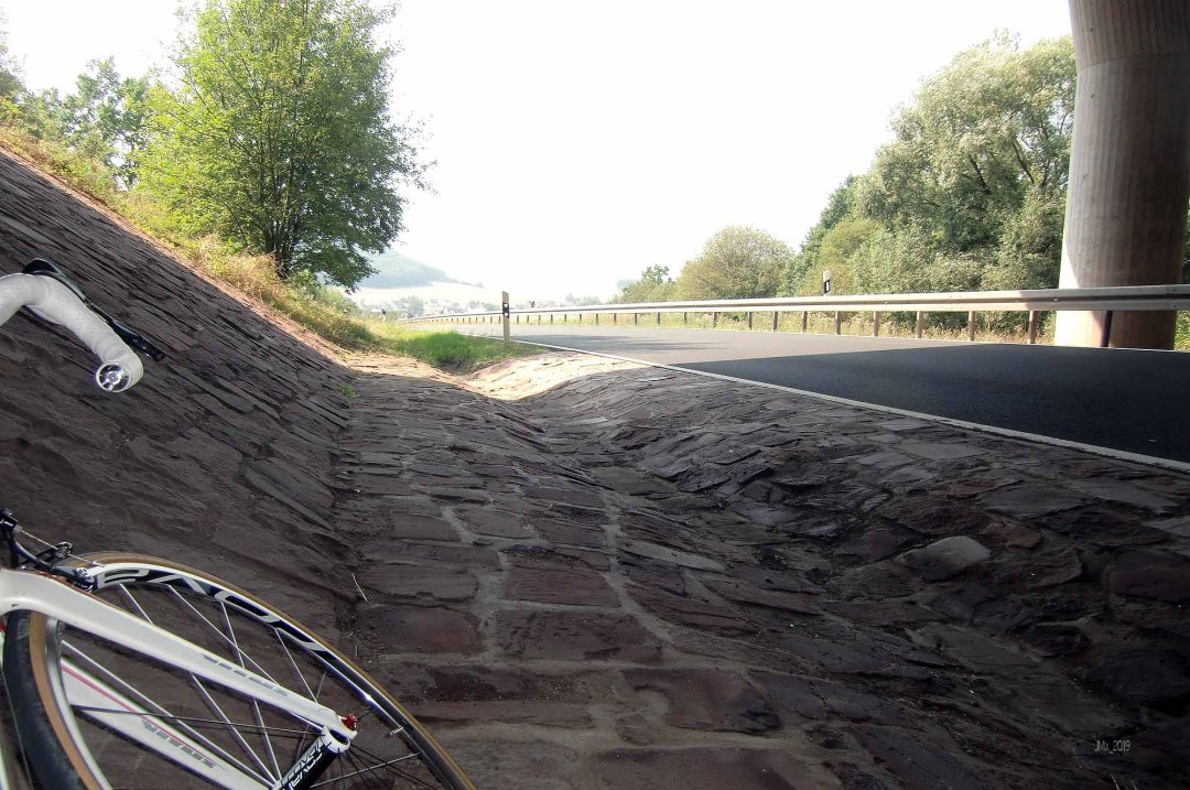 In mitigation I would say that I want to build up some endurance and I thought a road ride would do the job especially as it’s less physically hard on the body than thumping along gravel trails. As it was the sun was strong (temp 30 plus) and the last 20 kilometres (of 60) felt brutal on the exposed tarmac. The forest trails would have offered more protection and been nicer than sitting under an Autobahn flyover to get some shade (the semi-ruined Hanstein Castle can just be made out on the hill).