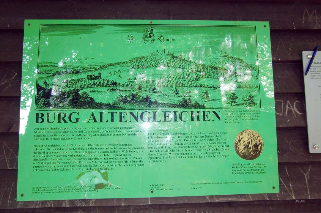 The castle upon the Alte Gleichen was built in the 12th century and on the Neu Gleichen a little later for the Counts of Reinhausen before the Knights of Gleichen took over. Neither castle fell in war rather they simply became disused when the Knights sought greater luxury in their Manor House in nearby Appenrode. Like so many other castles they became quarries for stone but whilst the Neu Gliechen has gone completely some of the Alte Gliechen remain in ruin including a wonderful fire hearth and large stone walls.