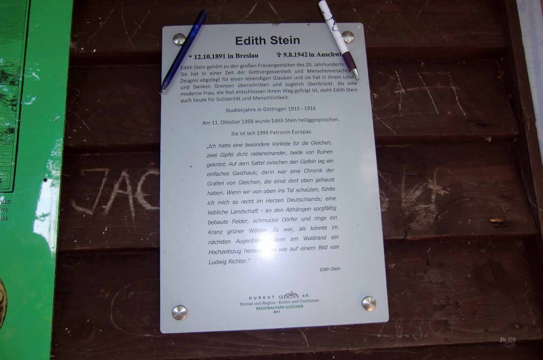 On the Old Gleichen is a plaque in commemoration to Edith Stein who was born into a Jewish family before converting to the Roman Catholic faith and who loved this area writing much about it. She was subsequently murdered by the Nazi’s at Auschwitz and is now a Saint of the Catholic Church. People have left pens as a mark of remembrance to her.