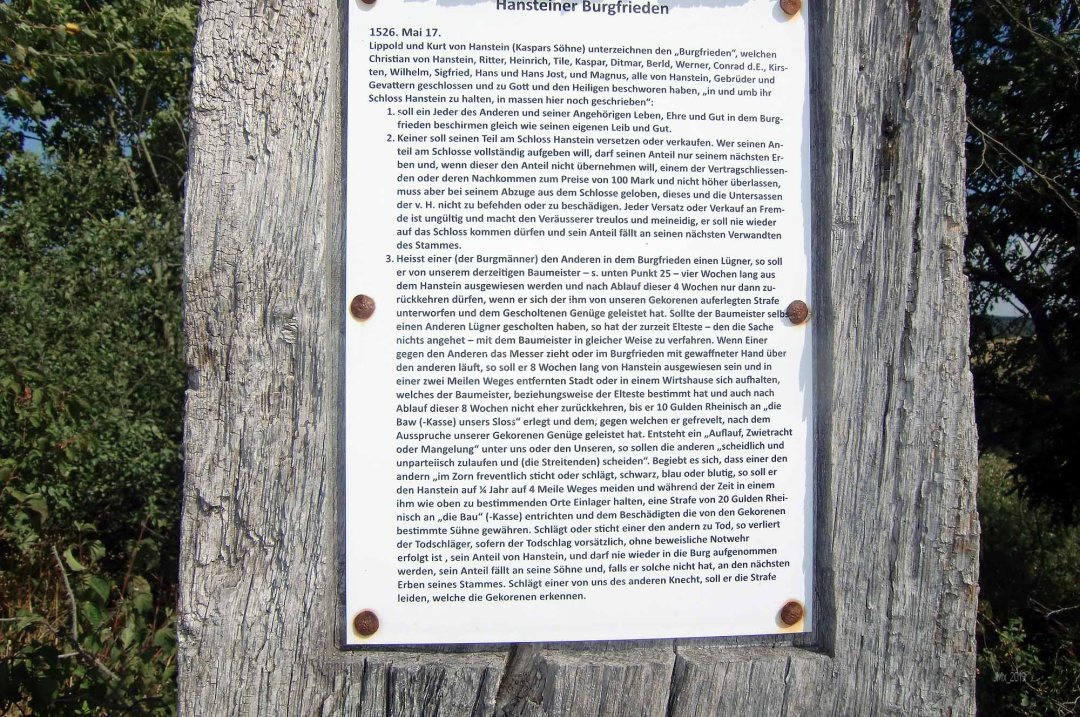 The intrigue of the local politics (Games of Thrones style, I think) even saw the Pope have to settle a long running dispute between the locals where tempers and intrigue ran strongly. Additionally because the Hanstein Castle was not linked with any major city or town the castle dwellers became robber barons due to a lack of people and activities to tax.