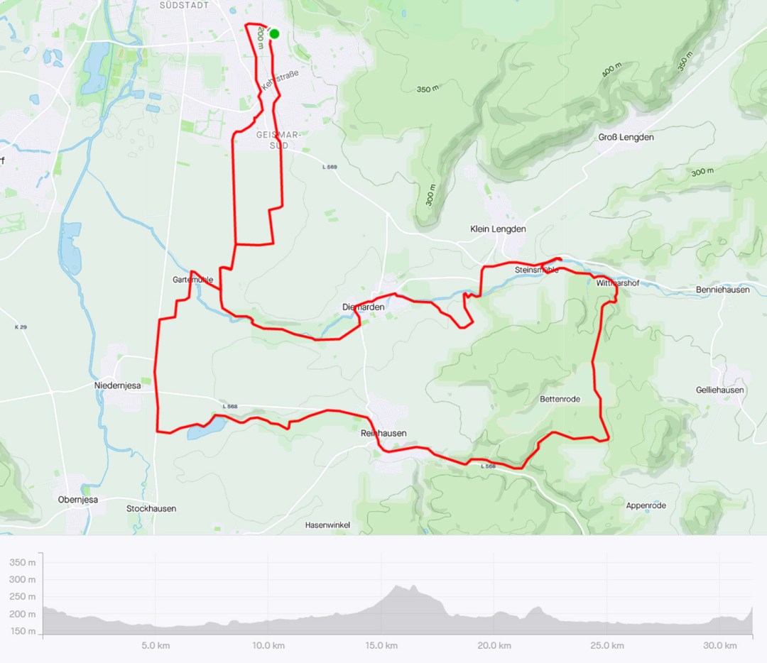 32km, with a few hills including the Tillyberg at over 28% also known on Strava as UP Zum Kirschberg.