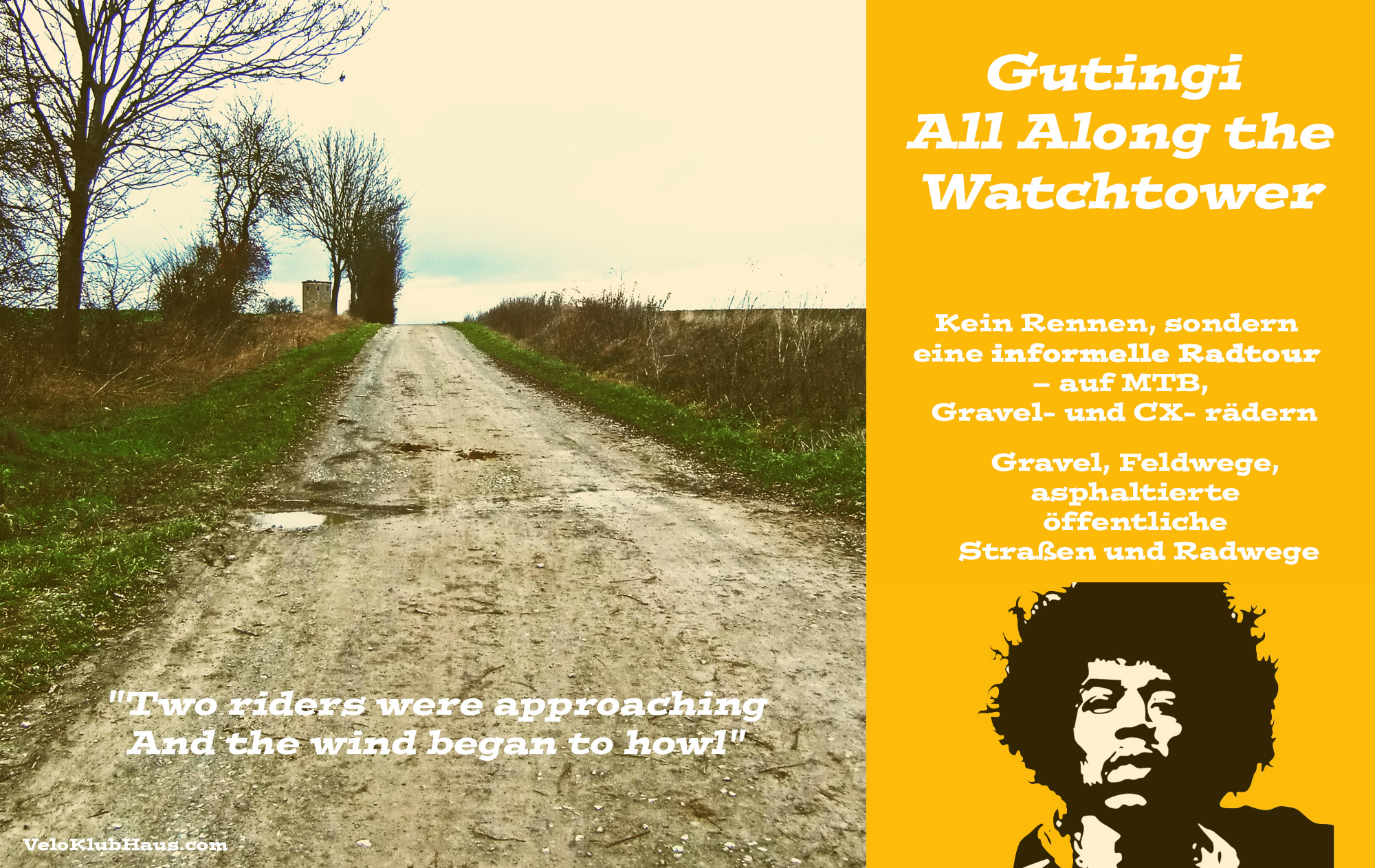 Die All Along the Watchtower ist ein Routenvorschlag für eine Fahradtour und kein Rennen oder Wettkampf. Solltest Du Dich dafür entscheiden, unserer Tourbeschreibung oder einem GPS der beschriebenen Route zu folgen, tust Du dies auf eigene Gefahr.