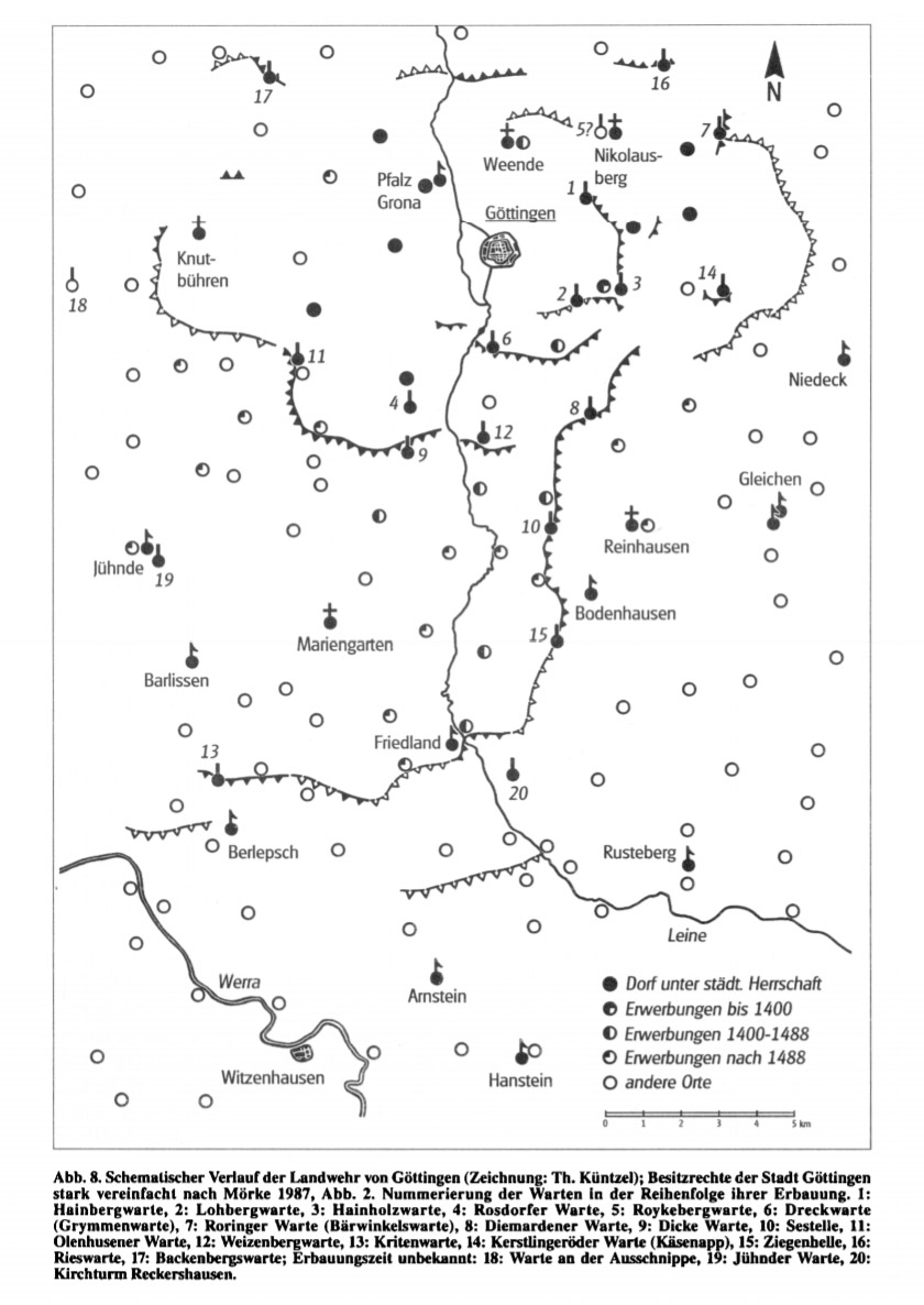 Mitteleuropa und die von deutschsprachigen Menschen bevölkerten Länder waren alles andere als friedlich. Die Landschaft ist von einem Netz von Wachtürmen (Warten) überzogen, die die Zufahrtswege von Städten wie Göttingen überwachten. Die Göttinger Warten waren Teil einer mittelalterlichen Verteidigungslinie (Landwehr) die aus dichtem Gestrüpp (z.B. Weißdorn) und Gräben bestand, welche Reisende auf Wegen und Straßen in Richtung der Kontrollpunkte leiteten, wo auch Zölle und Steuern kassiert wurden.