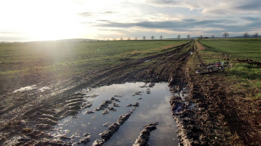 Eine 30 km lange Fahrt – einschließlich des Kopfsteinpflasteraufstiegs auf die Zieten-Terrasse, eines schneebedeckten Kesterlingröder-Feldes (obwohl es aufgetaut war) und eines langen, schneefreien Abstiegs ins Leine-Tal.