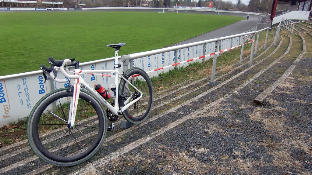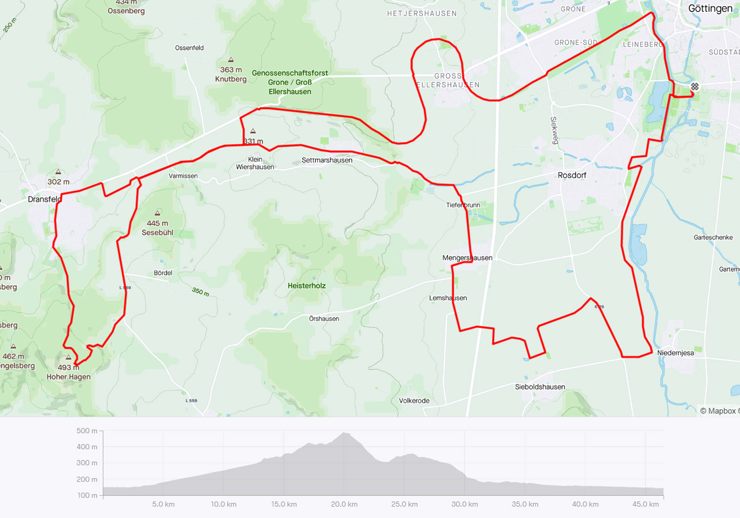 Feier der Frühlingsklassiker – Schotter und Asphalttour auf 28 Pflasterreifen: Gö Velodrom – Dransfeld Rampe – Radweg bei Rischenkrug (B3) nach Dransfeld – L559 und dann der Asphaltaufstieg auf die Hoher Hagen – Dransfeld – Gö Velodrom.