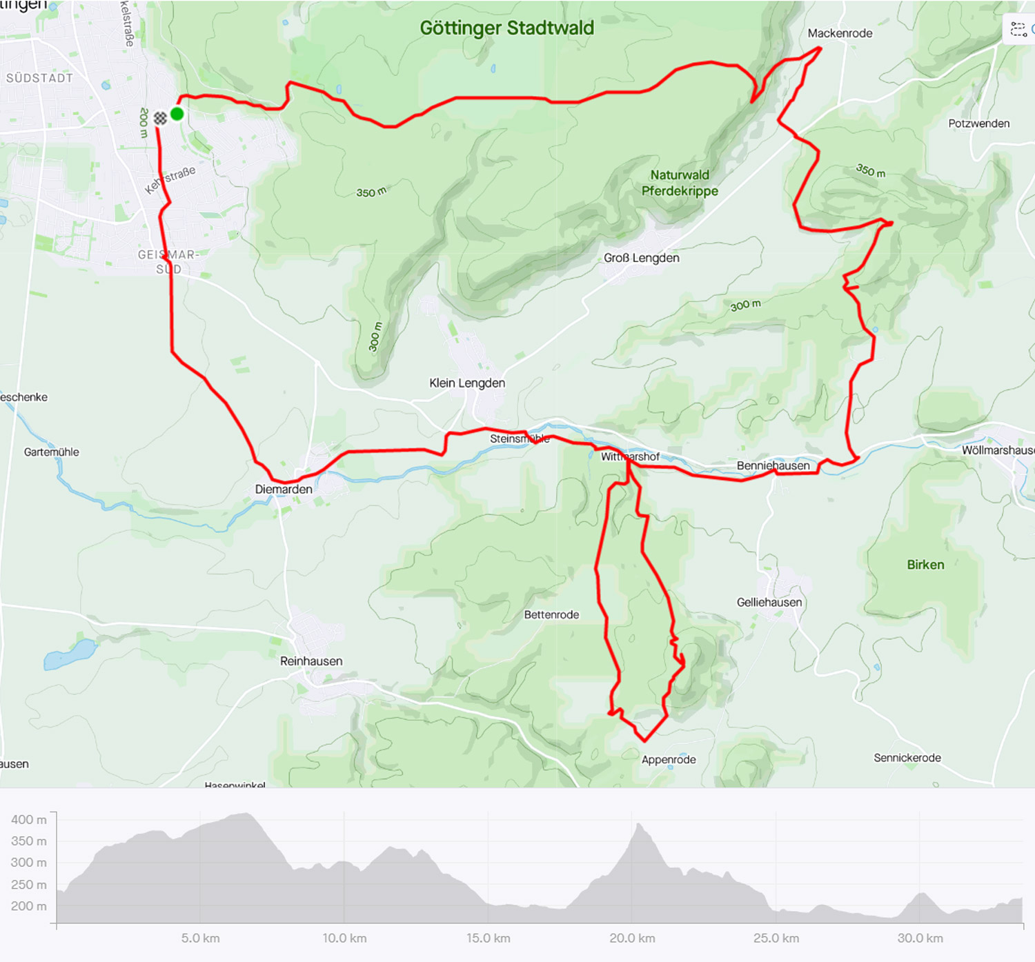 The ride took me up and across the Gö Stadtwald, down to Mackenröde and up again skirting the Hengstberg to the Alte Niedeck (388 metres). Here, I shot down via Niedeck on a mix of gravel and asphalt to the Gartetalbahn cycle path to Benniehausen.