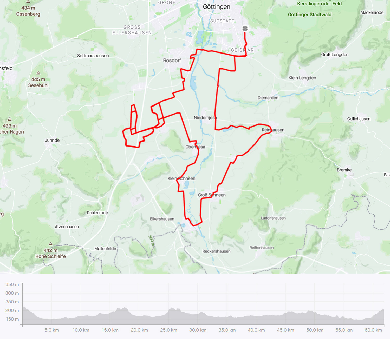 I headed out to Sieboldhausen which is visited four times to ride a figure of eight that includes one passage via Lemshausen plus Volkerode twice from differing directions although upon the same roads. I then weaved through Obernejsa (where there is a baker) onto Klein Schneen again on a mix of farm roads and cycle paths to Friedland, followed by Groß Schneen (another baker is here) before we head back to Gö via Ballenhausen and the Wendebachstausee where it is too cold for a swim….