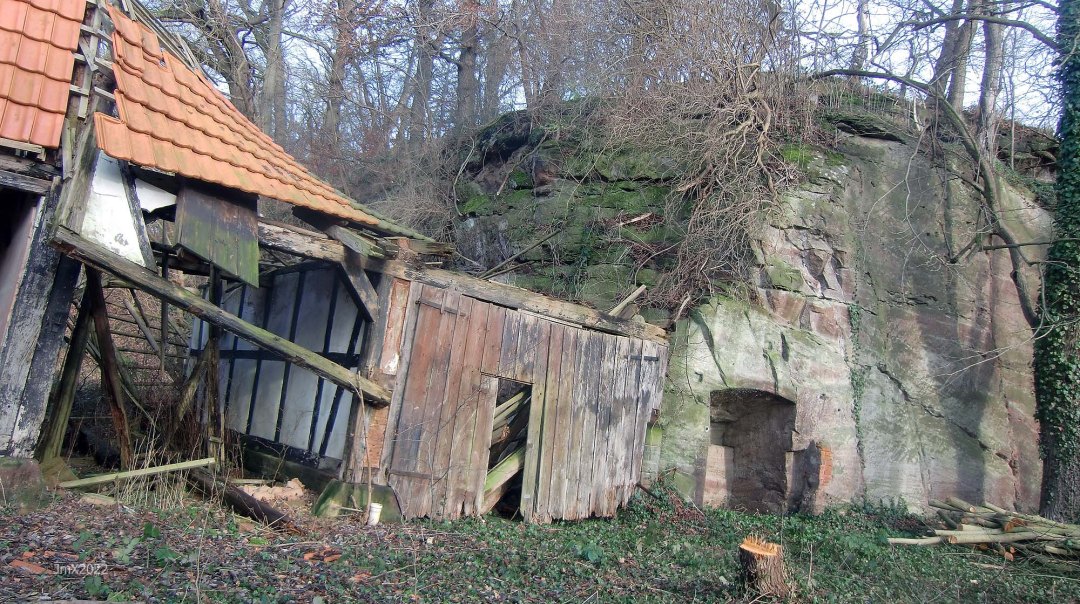 Steinsmuhle – the railway squeezed between buildings and the rock face, now blocked by a garage