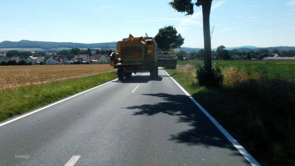 Its harvest time and on route one farmer decided to use the main road without altering the width of his harvester, it was quite a sight as the boon hit every object adjacent to the road. Despite this it all seemed to work.