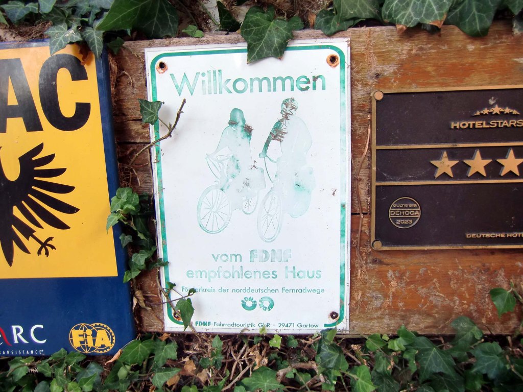In Friedland which is famous for its refugee/transit camp museum there is nestled within the timbered buildings of the old village is the Michelin starred Biewald Restaurant. Associated with it is a Bistro that has a sign of welcome for cyclists (https://www.landhaus-biewald.de/).