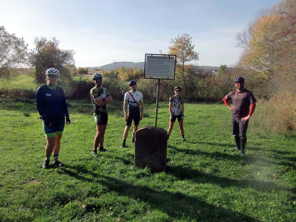 At the meeting point of three states, the Dreilländerstein and once an international border, Tim managed to fall off his bike in Lower Saxony, touched the soft earth in Hesse and, rolled into and theatrically stood up in Thuringia.