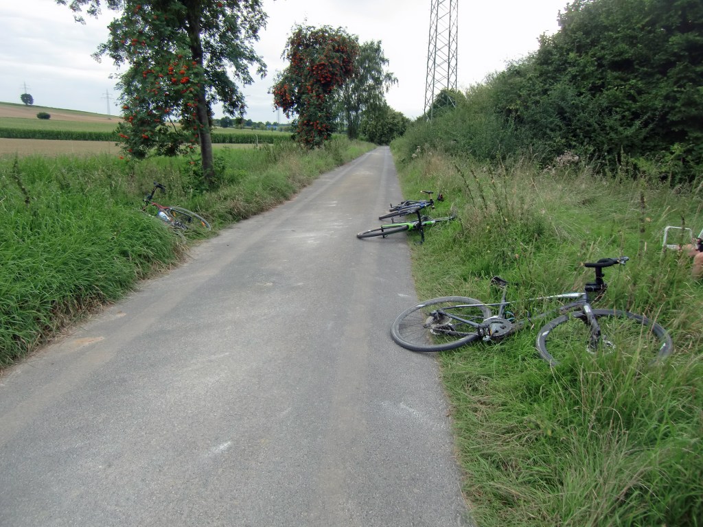 Konstantin, Andrea, Julia, and I rode the 40km Gö Feldweg Omloop but cut down by a few kilometres and with one diversion away from a cycle path now closed because of a 60 head of Galloway Cattle blocking the way.