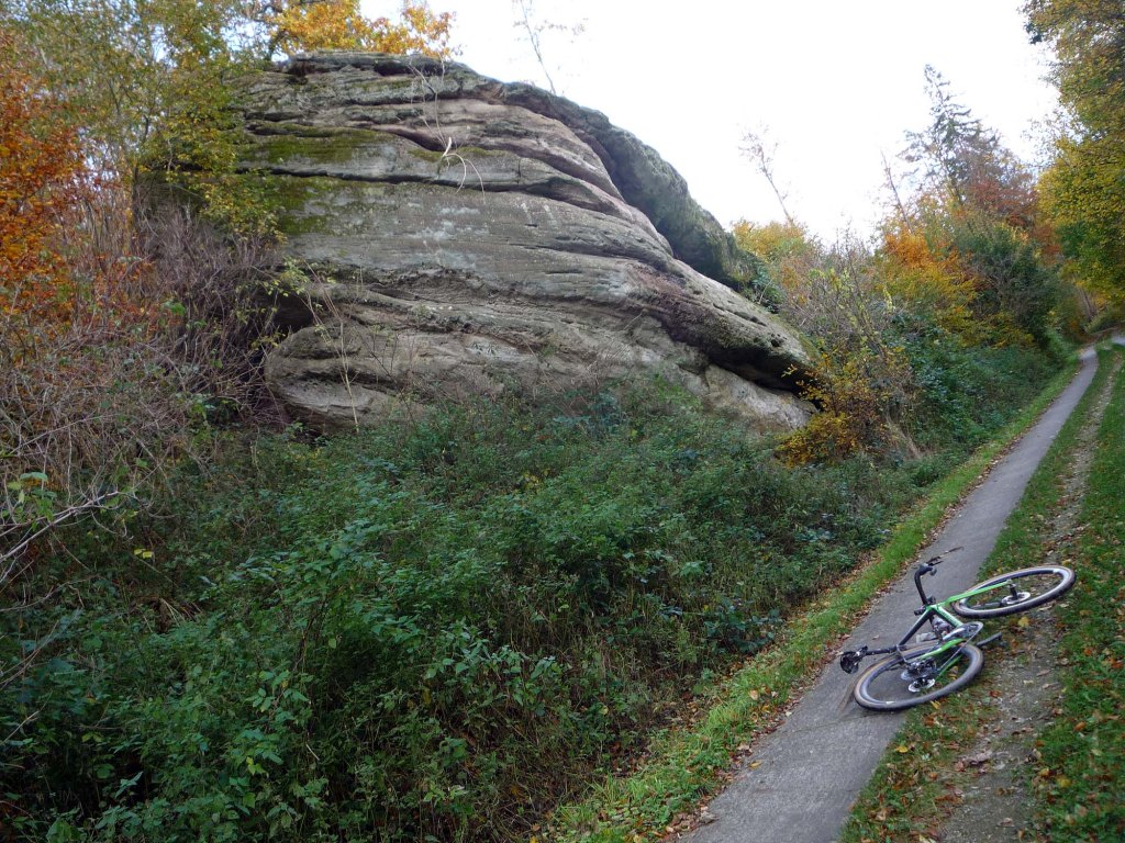 After Reinhausen (note the buildings carved into the rocks) we ride upon a concrete forest road lined with trees, then we continue up a well-drained gradual gravel climb and at the top we turn onto a track that although not flooded it does feature forest vehicle mud tracks for a short time. The rest is about avoiding the water filled potholes.