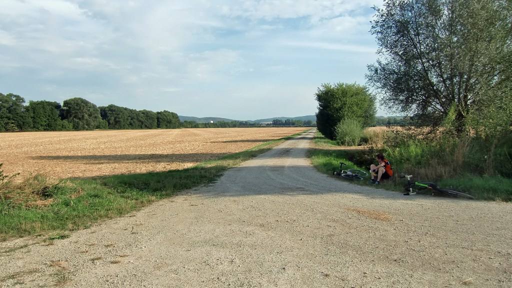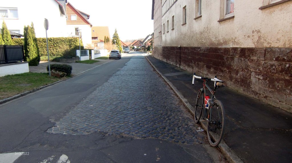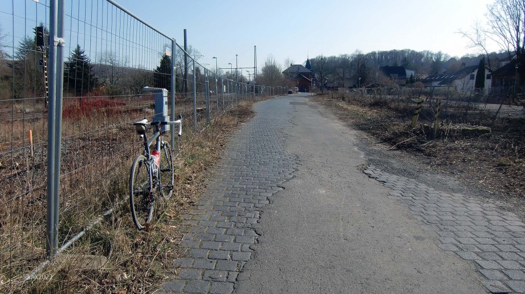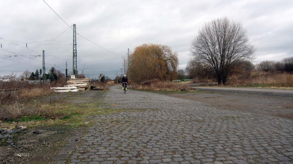 We ignore the asphalt cycle path and instead we ride the cobbles which run alongside the railway. 400 metres of pure pleasure!