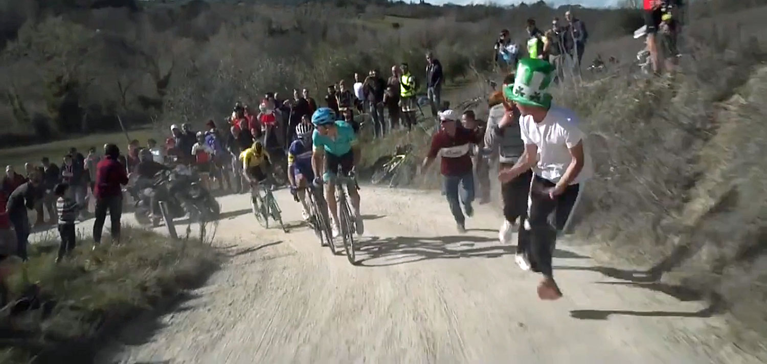 The route of the Strade Bianche features white gravel roads intermingled with tarmac and many climbs, these roads are dusty when dry and makes ‘mud people’ out of riders when wet (Giro 2010 – https://www.youtube.com/watch?v=BCg3pywV1D8).