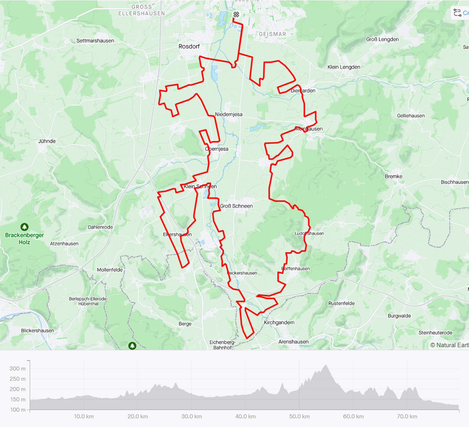 This 80 kilometre route merges the previous 66, 72km & 76km rides. The significant difference of this revised parcours is that it cuts out an asphalt climb away from Friedland toward Marzhausen and includes a more direct additional gravel road to Niedergandern. Plus, there is an added stretch of tree lined white gravel that almost takes us into Thuringia, but we turn away from what was once the Iron Curtain.